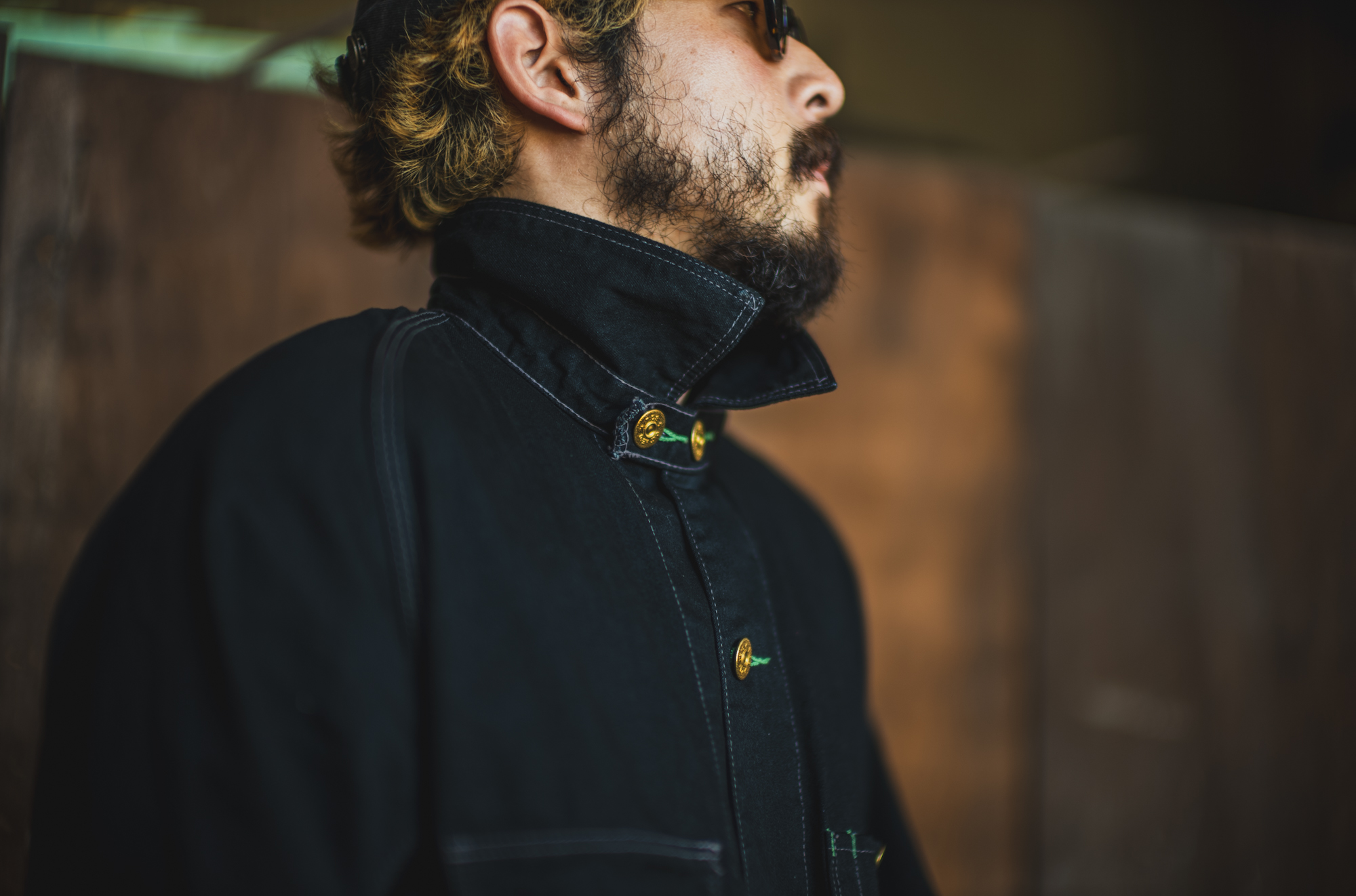 The green buttonholes and bar tacks, a distinctive feature of the Cat Head Jacket’s stitching work stand out beautifully against this jet-black fabric.