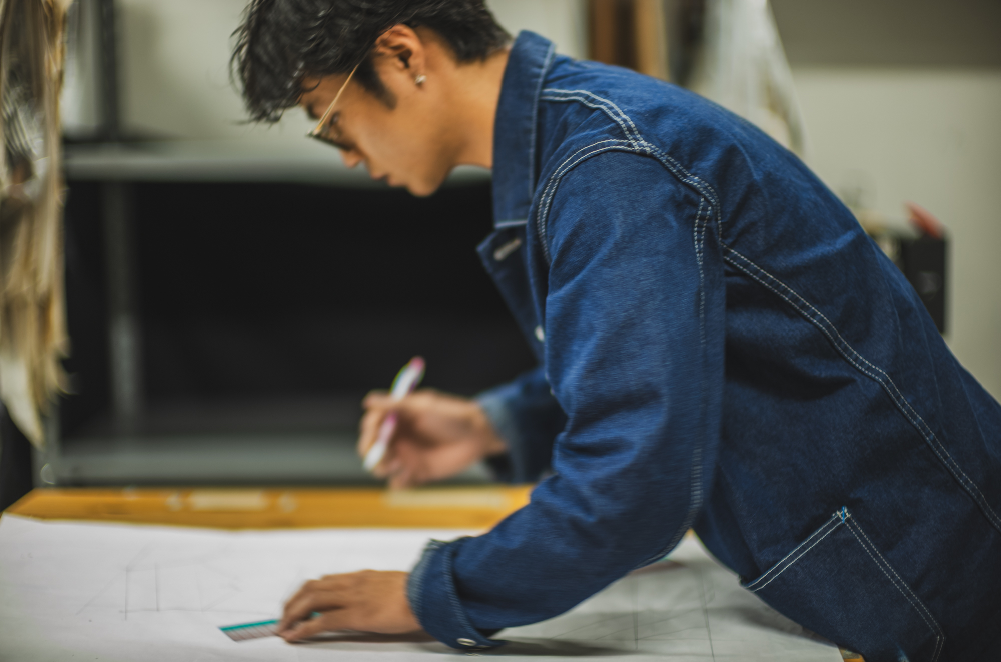 目をやると、溝口が自主練をしていて、Vintageのウエスタンシャツを元にパターンを引いているところでした。 好きなことに向ける純情な感情は、きっと空回りすることはないはず。