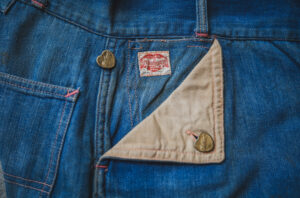 別生地で折り返された Mule Ear Pockets、そしてハート型のボタン。
