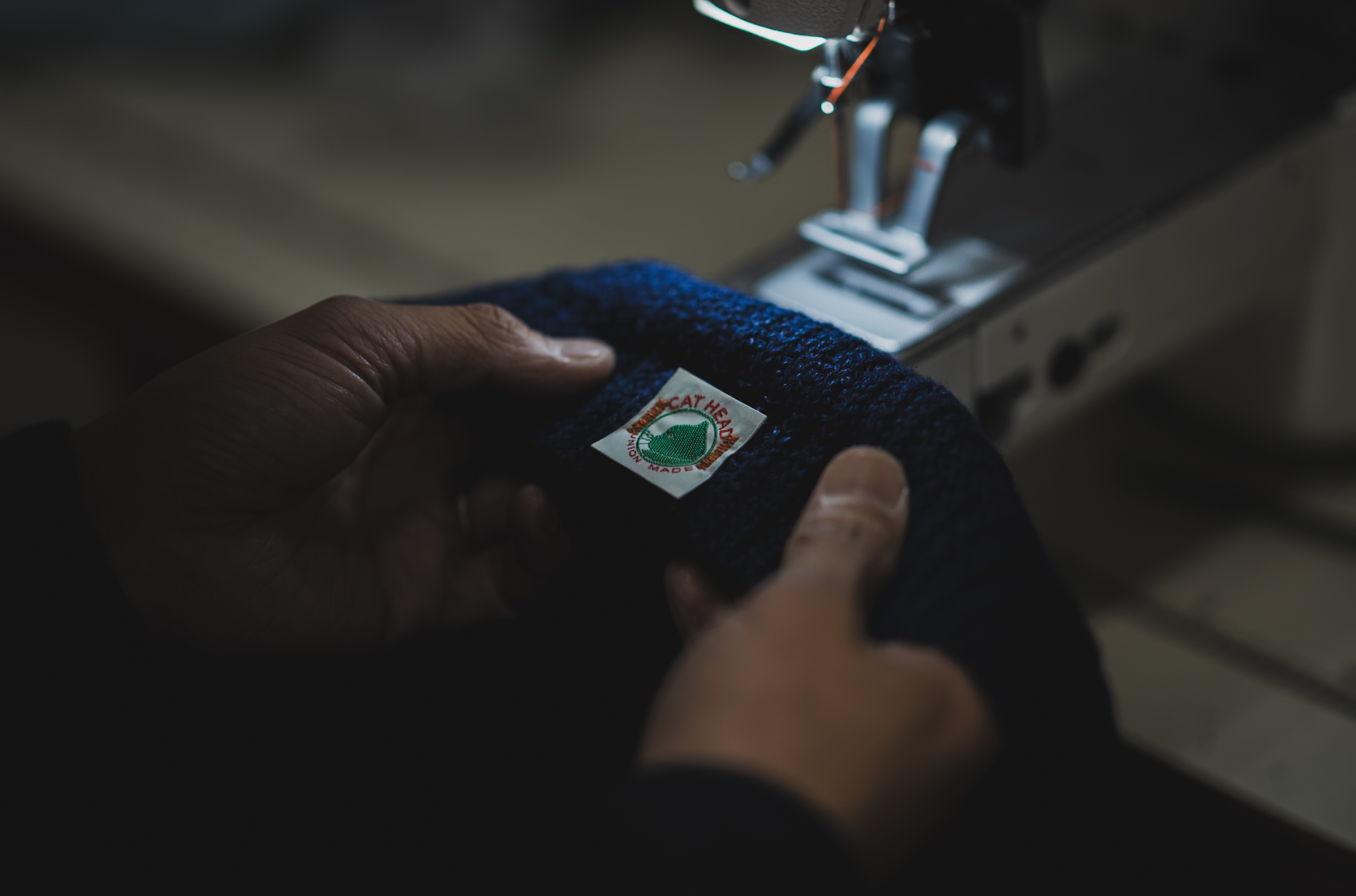 ですが、今年になって付き合いのあった帽子工場の方から”インディゴ染め糸専用の帽子織り機を作りました。TCBさんでぜひ、色落ちするニットキャップを作りましょう”とお声がけいただいて、ViktorのWW2 Capをベースに作ったのが今回のCat Head Beanieとなります。Cat Headというピッタリなネームもあるし、ネームはジーンズ工場らしくオレンジのバータックで留めてあります。二つ折りで短く被るもよし、寒い日は一つ折にして耳を隠す形で被るもよしで、ジーンズ工場であるTCBらしいBeanieに仕上がりました。