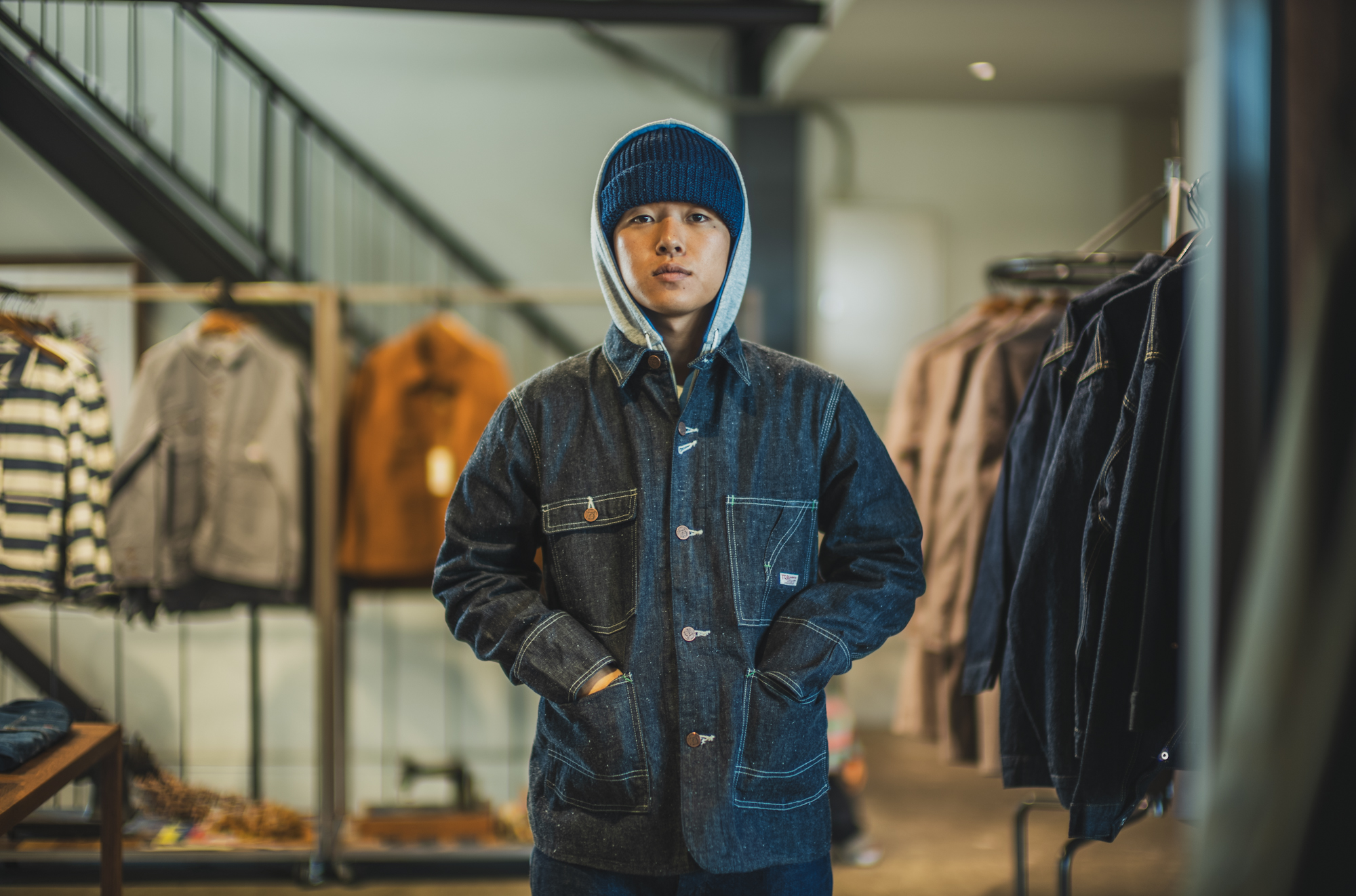 Since TCB staff wear head-to-toe denim all year-round, it’s easy to tell who’s wearing what model. For me, it’s the hat, for the factory manager, it’s the beanie, and it’s interesting to see how each of us expresses our style through the headgear, in addition to the fading of the denim. (Now, we have TCB-made Beret and Beanie. I hope we can make a TCB made hat one day…)