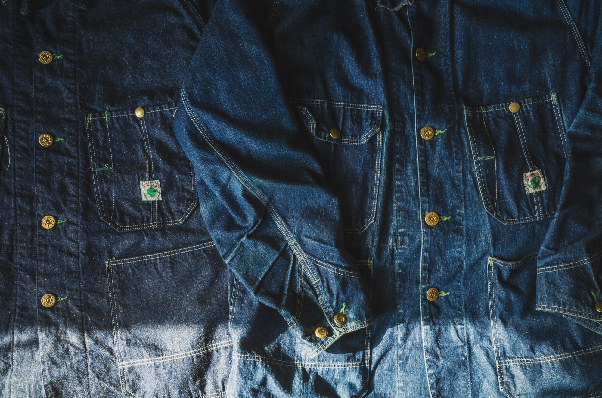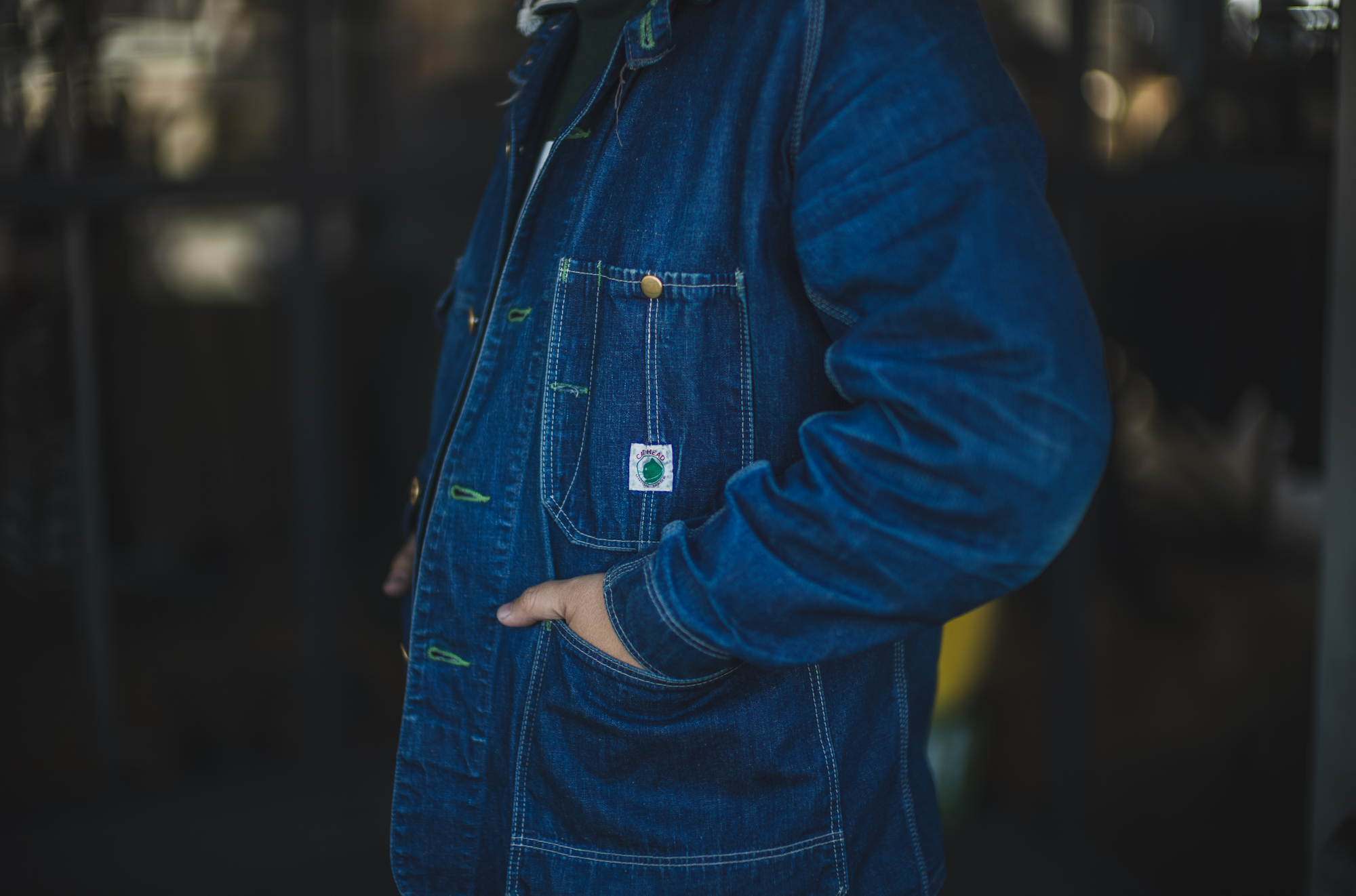 Linking the green accents of the hoodie with the Cat Head name tag, buttonholes, bartacks,