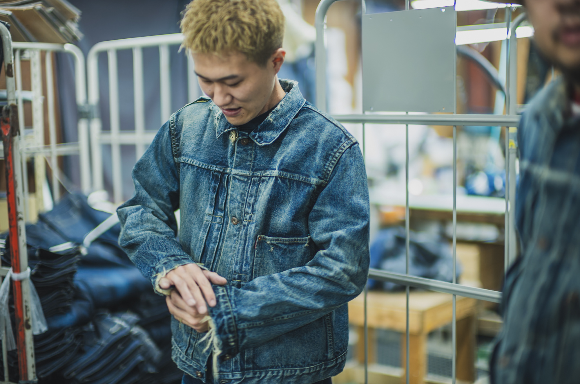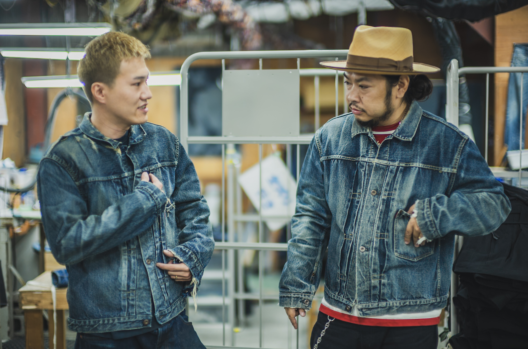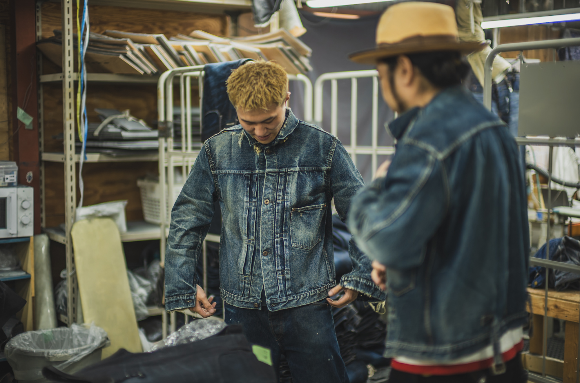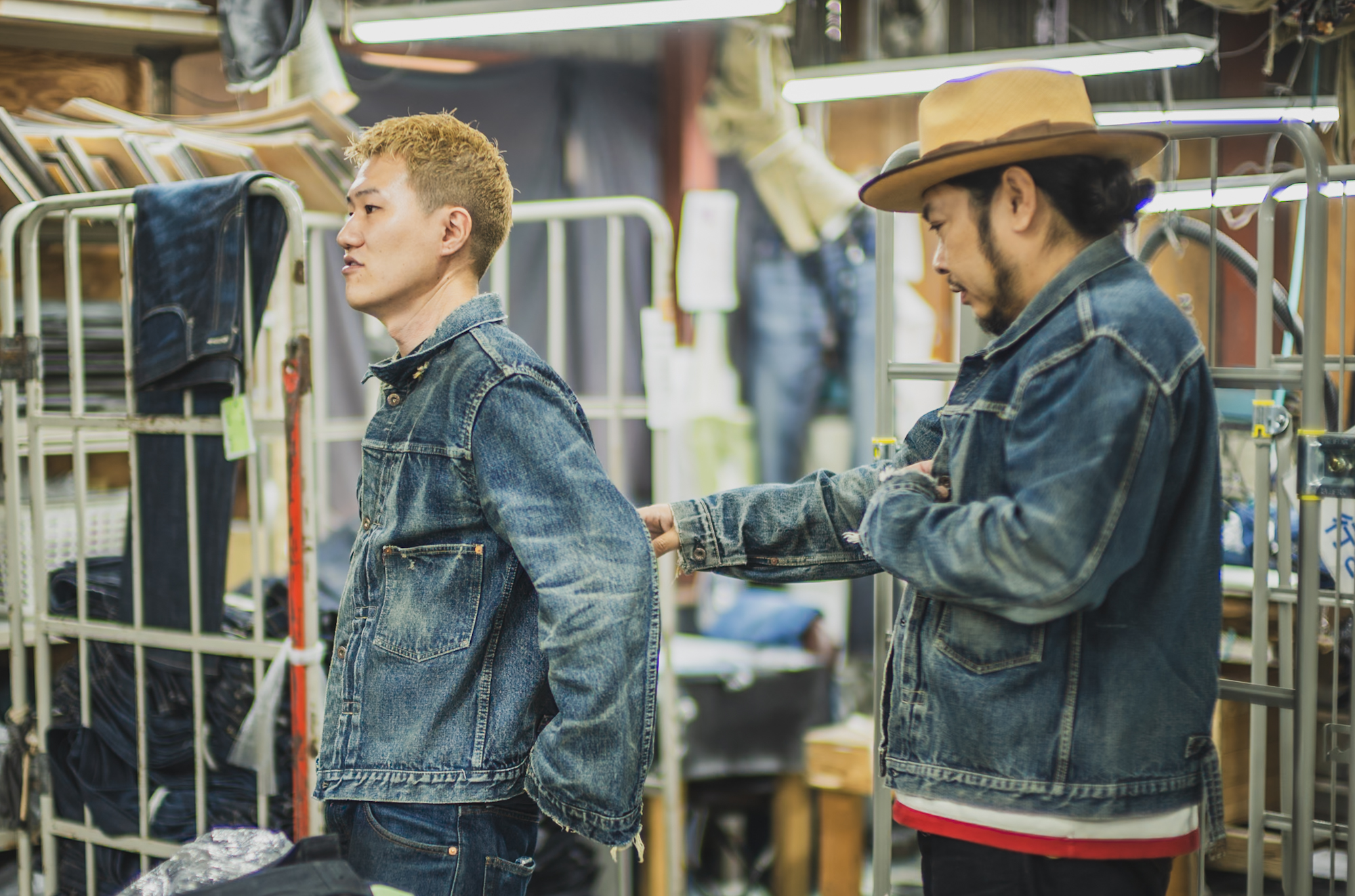※The jacket worn by the person on the right appears lighter because it has not yet gone through the final dyeing process.