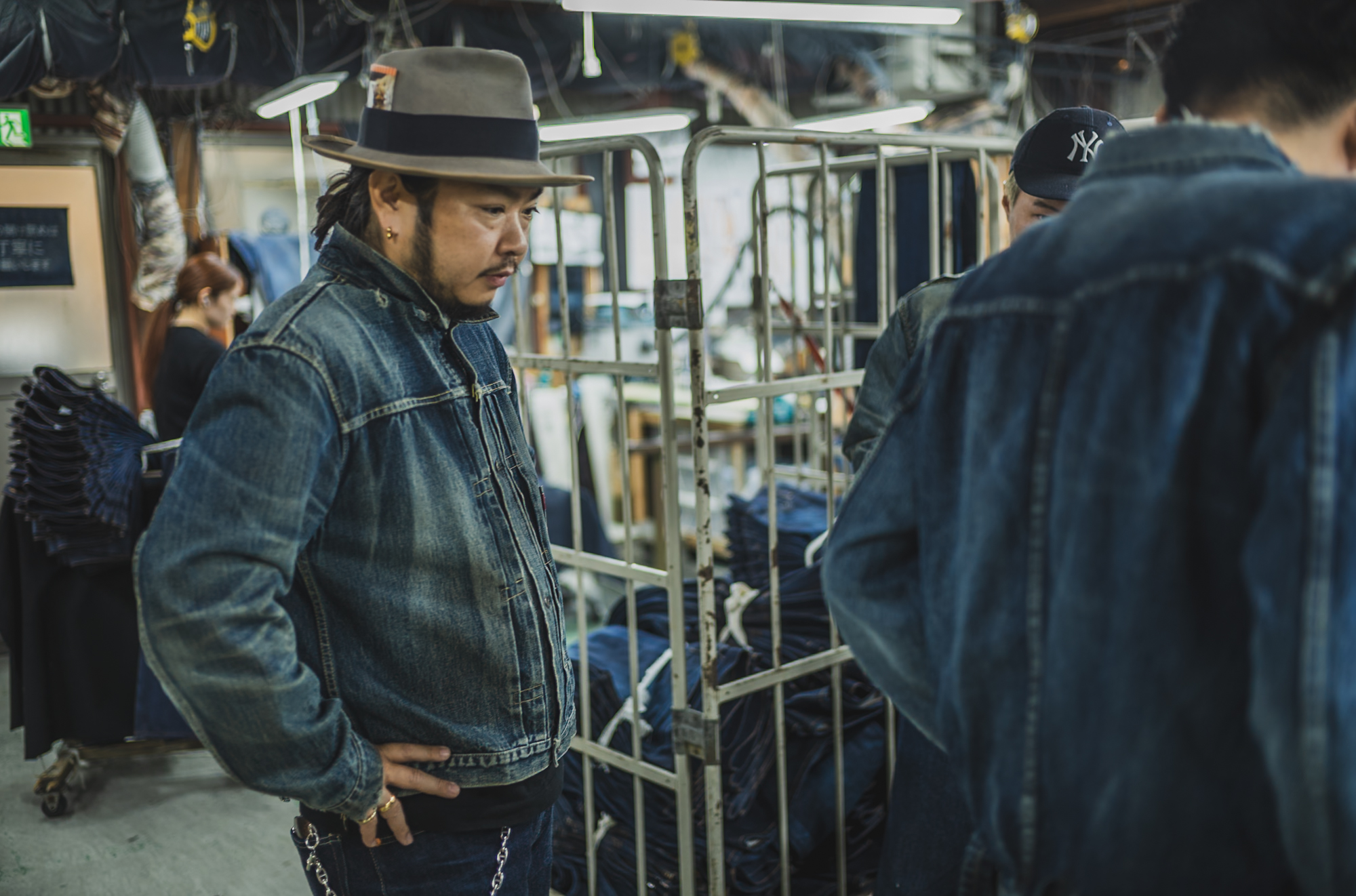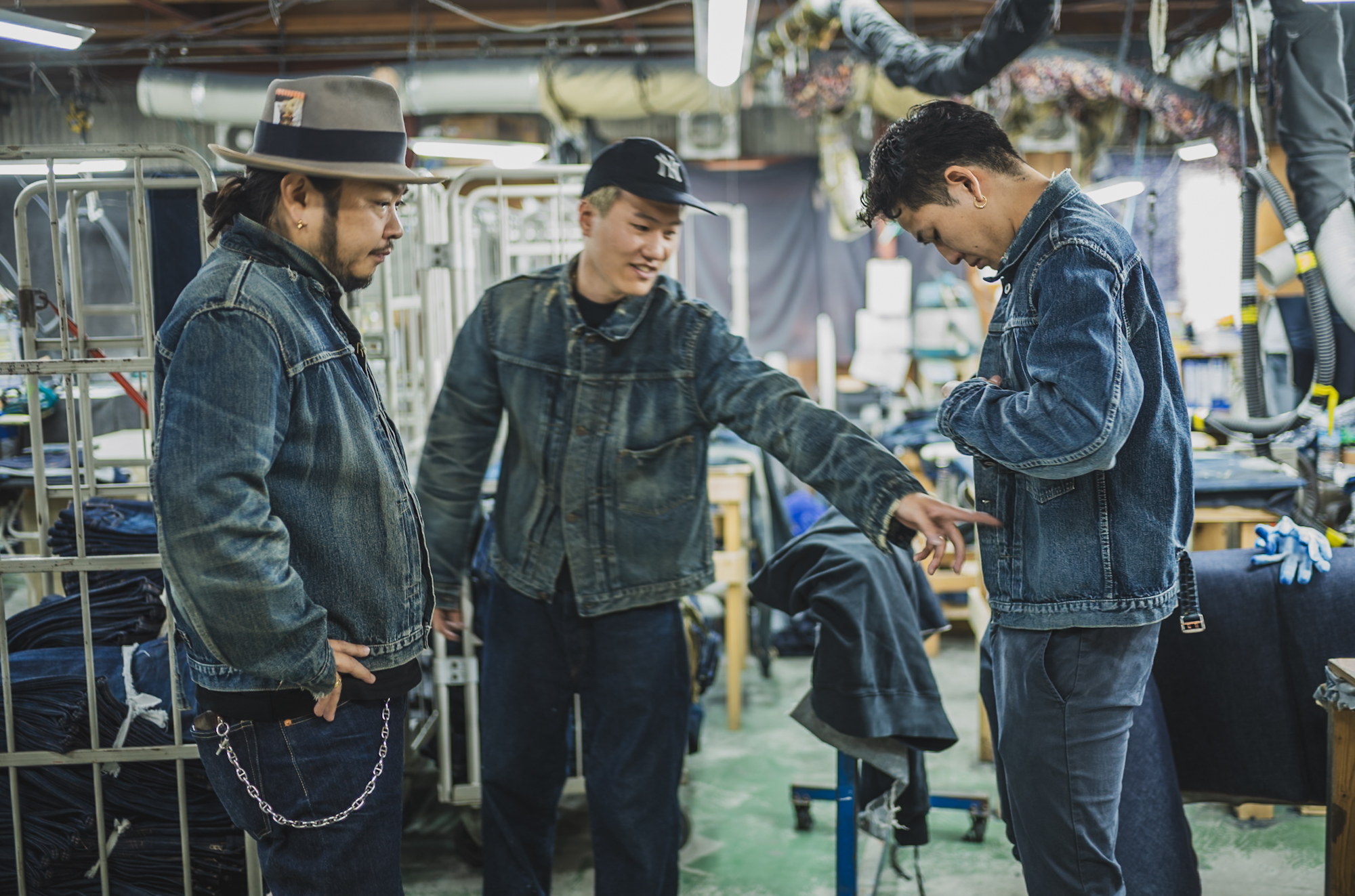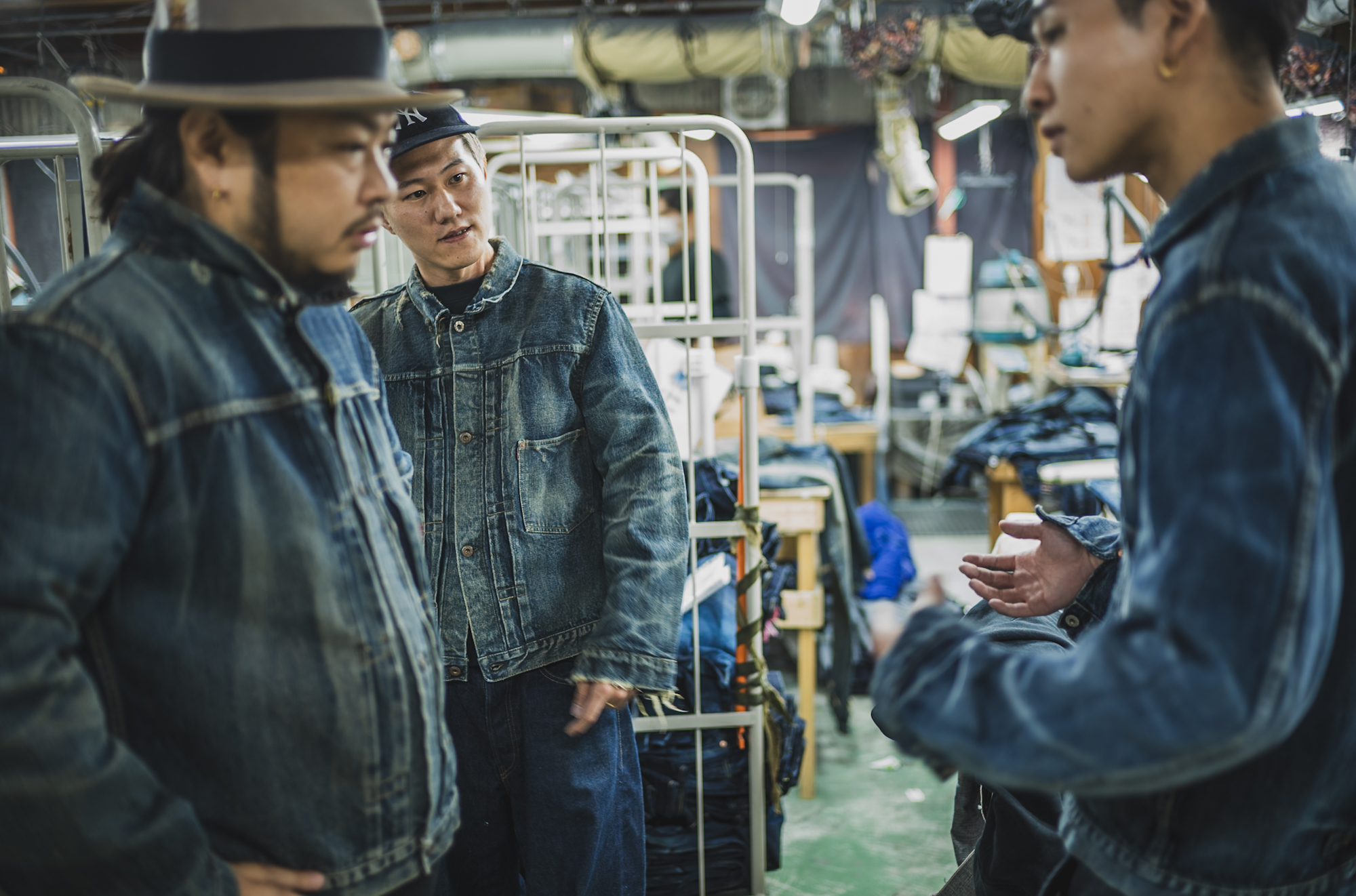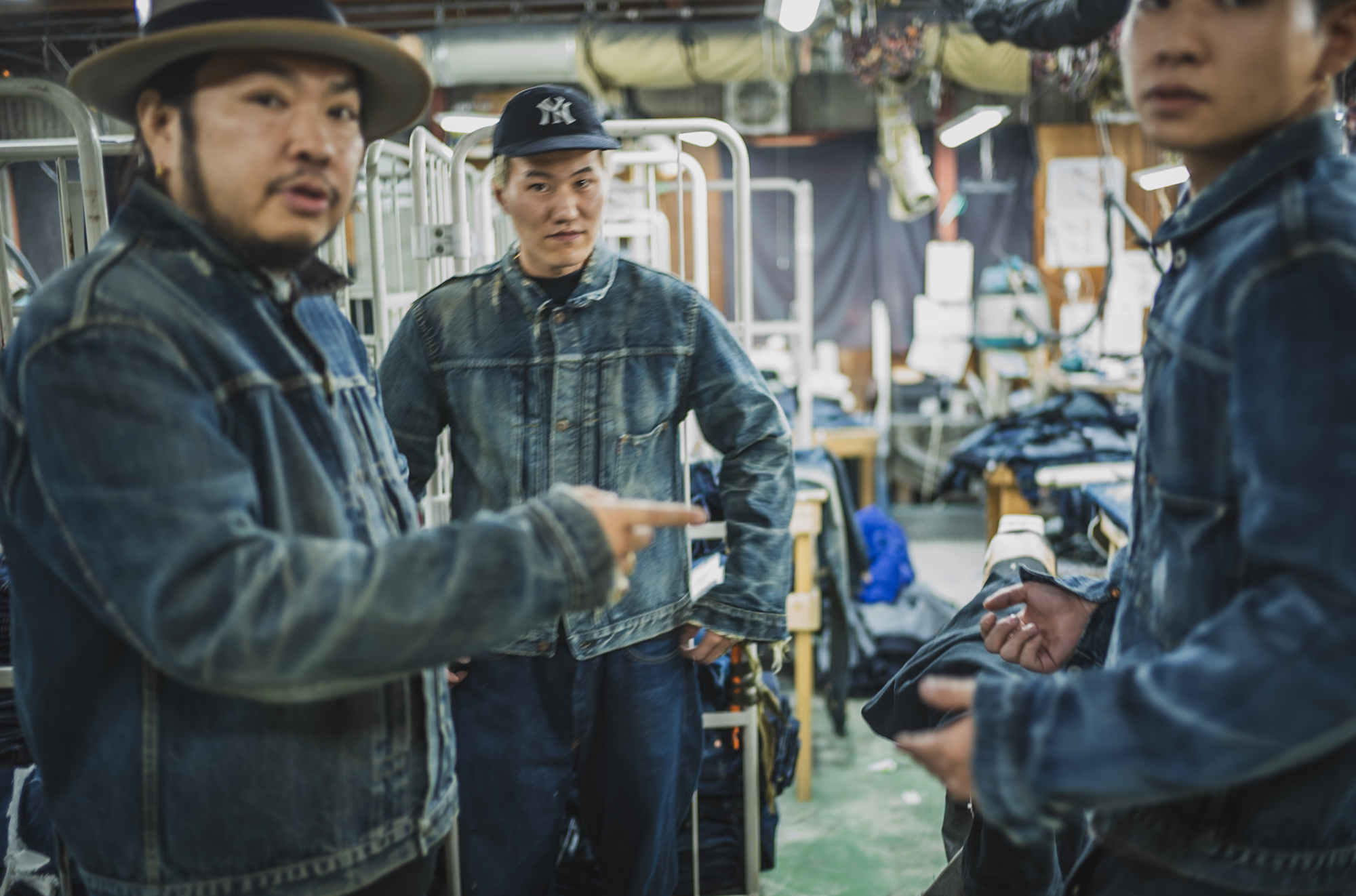 ※The jacket worn by the person on the right appears lighter because it has not yet gone through the final dyeing process.