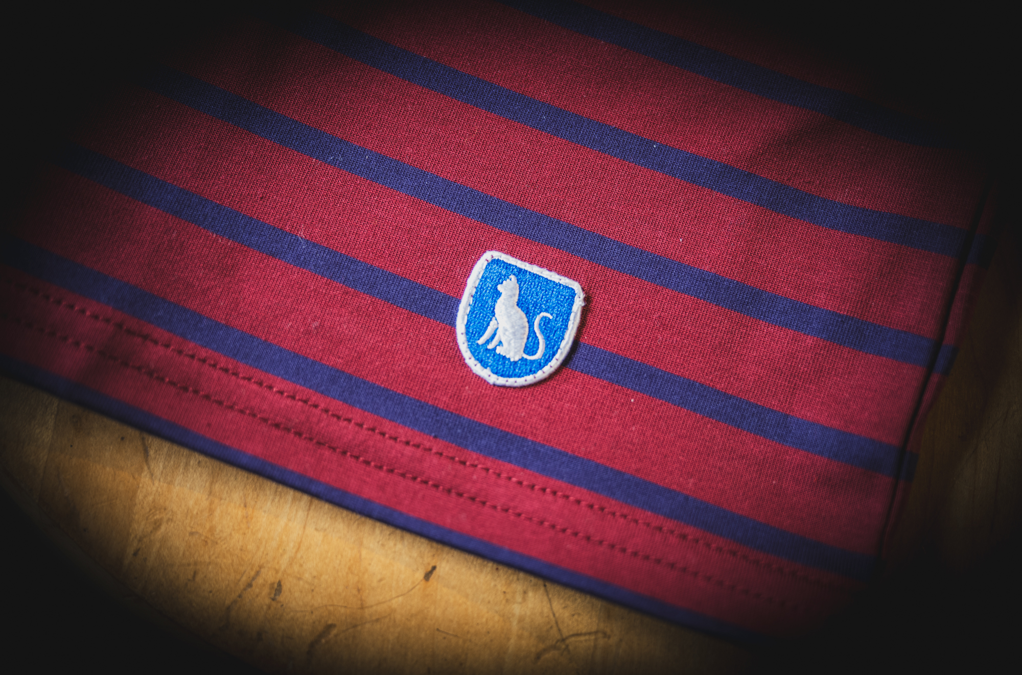Red × Navy with white at the neck.